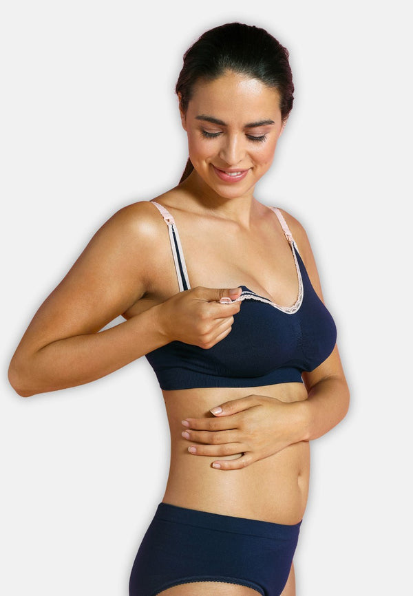 Ovaj grudnjak nam dolazi u dvije boje - bijeli i deluxe plavi sa rozom čipkom. Za ovaj grudnjak možemo reći da je jedan od najudobnijih grudnjaka koji se proizvode. Bez šavova i bez krute žice ispod košarica, pruža izuzetnu udobnost, a takođe i zdravlje. Ovaj grudnjak je savršen za osjetljive i bolne grudi, a osim toga nježan je na koži bebe, koja zahtijeva maksimalnu brigu i pažnju. Tkanina se oblikuje prema tijelu i grudima koje se mijenjaju. Široka donja traka zamjenjuje donju žicu, tj. pruža dodatnu podršku i obezbjeđuje „podizanje“ grudi. Uz ovaj grudnjak u paketu dobijate i produžetak grudnjaka koji povećava mogućnost podešavanja, odnosno možete podesiti koliko ćete stegnuti grudnjak, kao i koliko ćete spustiti grudnjak. Carriwell bešavni grudnjak za dojenje je snažno podržan od strane konsultanata za laktaciju.