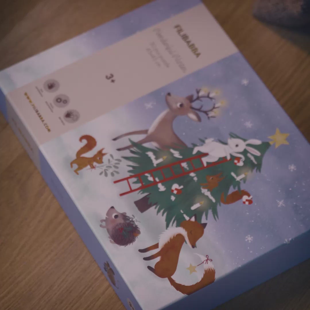 Zimski motiv prikazuje šarmantnu snježnu scenu sa svjetlucavom jelkom, omiljenim šumskim prijateljima FILIBABBE i magičnim zvjezdicama koje plešu nebom. Ručno crtana ilustracija dočarava toplinu i čudo sezone, stvarajući veselu i očaravajuću atmosferu za male slagalice.